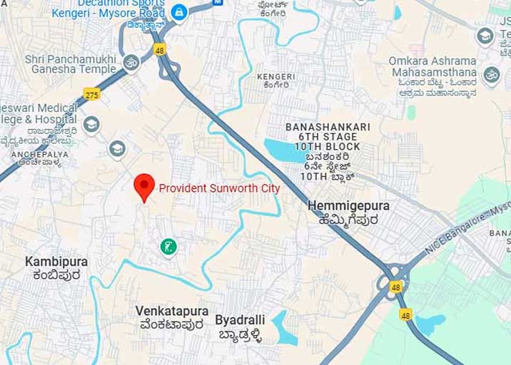 Located off Mysore Road-NICE Junction, Provident Sunworth City is the largest township in South Bengaluru, sprawling over mammoth ~60 acres. Situated close to the Challaghatta metro station, a home here brings every convenience to your doorstep without any compromise on connectivity to the rest of Bengaluru. With 19 acres of dedicated green cover which encapsulate 7000 trees, behold the mesmerizing views of this green sanctuary with your loved ones.